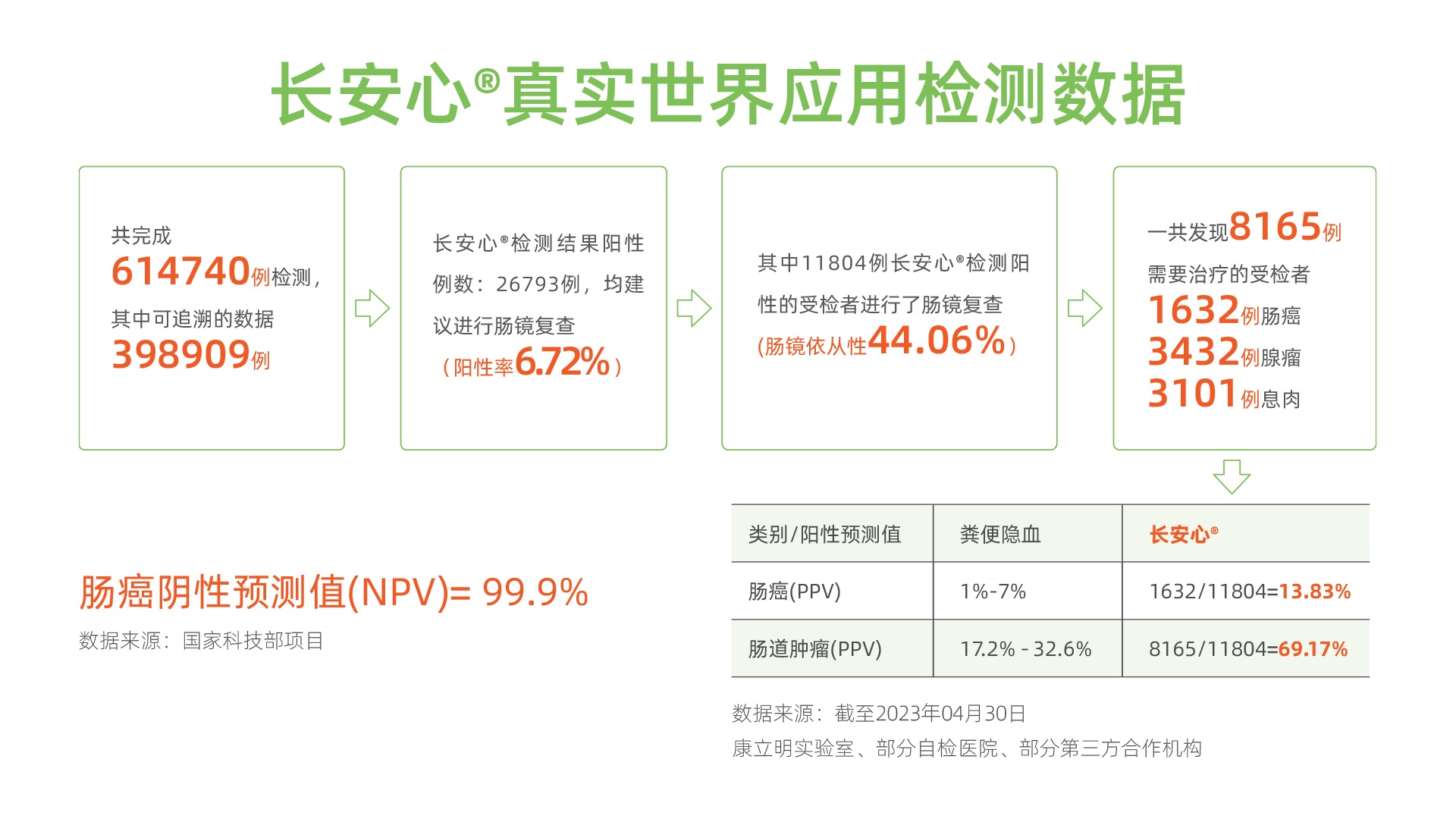 在“人類健康,我之使命”崇高理想下,發(fā)揚(yáng)康立明生物的社會責(zé)任與擔(dān)當(dāng)精神,以長安心®等腫瘤早篩產(chǎn)品的優(yōu)越性能,引領(lǐng)行業(yè)的技術(shù)標(biāo)準(zhǔn),創(chuàng)新的公共衛(wèi)生篩查模式,加大人群的參與度來實(shí)現(xiàn)腫瘤的早診早治。來自康立明醫(yī)學(xué)檢驗(yàn)實(shí)驗(yàn)室、部分自檢醫(yī)院、部分第三方合作機(jī)構(gòu)的數(shù)據(jù)顯示:截至2023年4月30日,長安心®共完成614740例檢測,其中可追溯數(shù)據(jù)398909例。長安心®檢測結(jié)果陽性數(shù)26793例(陽性率6.72%),均建議進(jìn)行腸鏡復(fù)查,其中11804例長安心®檢測陽性受檢者進(jìn)行了腸鏡復(fù)查(腸鏡依從性44.06%)。