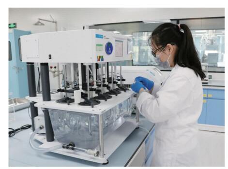 眾生睿創(chuàng)被黃埔區(qū)評(píng)為潛在獨(dú)角獸企業(yè),并入選首屆粵港澳大灣區(qū)新經(jīng)濟(jì)先鋒企業(yè) 50 強(qiáng)。圖為科研工作者在操作自動(dòng)取樣溶出儀。張玉榮 / 攝