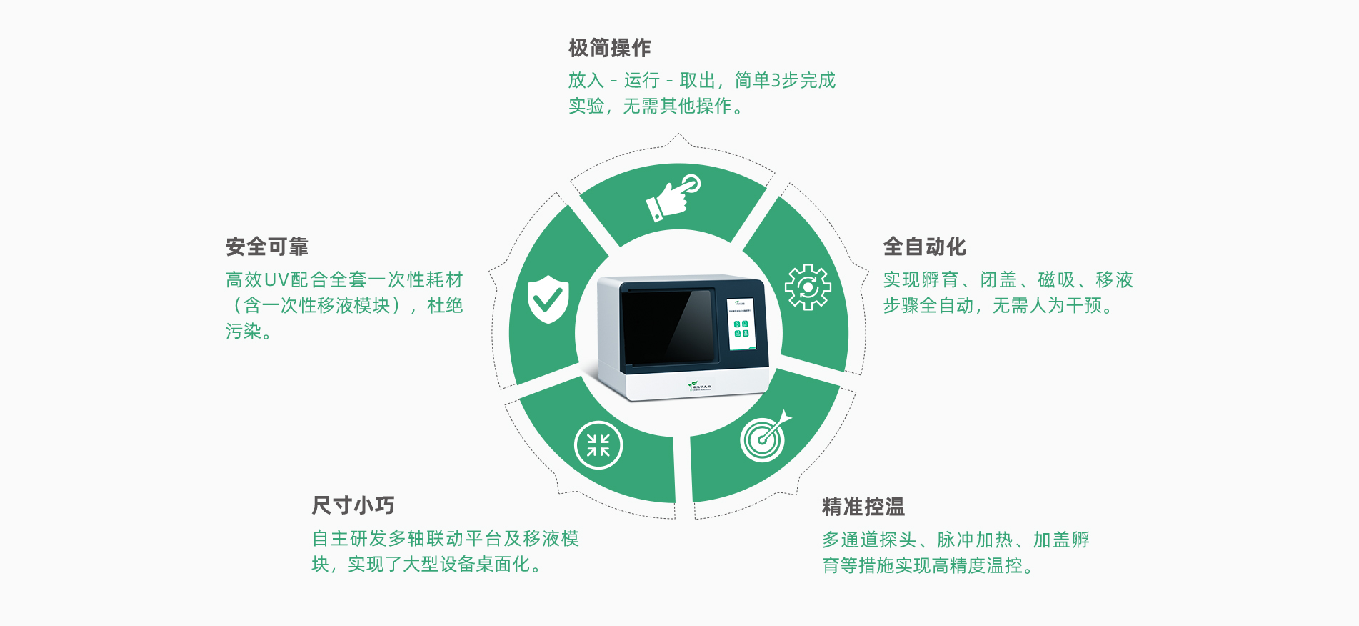 全自動核酸提取儀H24采用了自主研發(fā)的移液模塊、孵育模塊,通過磁珠法全自動實現(xiàn)大體積復雜樣本基因組DNA的提取、富集、轉化、純化過程,解決了復雜樣本高質(zhì)量核酸自動化提取轉化難題。設備采用多軸聯(lián)動的自動化平臺,配合獨創(chuàng)的移液模塊,極大地縮小了移液平臺尺寸,同時提高了設備運轉效率。